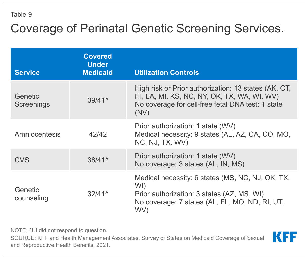 Most responding states (38 of 40) cover 1st trimester genetic screening for pregnant women. Many of the states require prior authorization and specific medical conditions must be met such as high-risk pregnancy conditions and age-related risk (Table 9). Several states noted specific medical necessity requirements for the relatively new cell-free DNA tests. Nevada reported that they do not cover cell-free DNA tests.