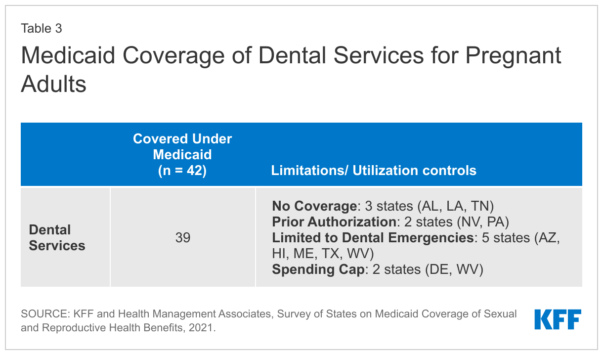 - Most of the responding states cover dental services for pregnant Medicaid enrollees, however, five of these states limit coverage to emergency dental services and do not cover preventive dental care. There is some evidence that pregnant people are at higher risk for periodontal disease during pregnancy and that a mother’s dental health status is linked to her child’s future dental health.
