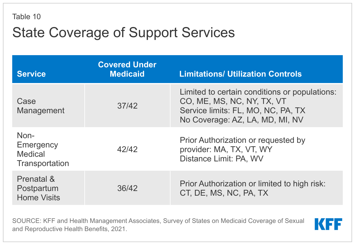This survey was conducted at a time of greater national attention to the state of maternal health, an area where Medicaid has long played a major role. On the whole, this survey finds that states offer broad coverage for basic pregnancy-related services, but that some impose utilization controls. Coverage for services outside of the medical setting is mixed, with most states covering home visits but limited coverage for educational classes and home-base lactation consultations. Very few states offer any coverage for fertility assistance services.