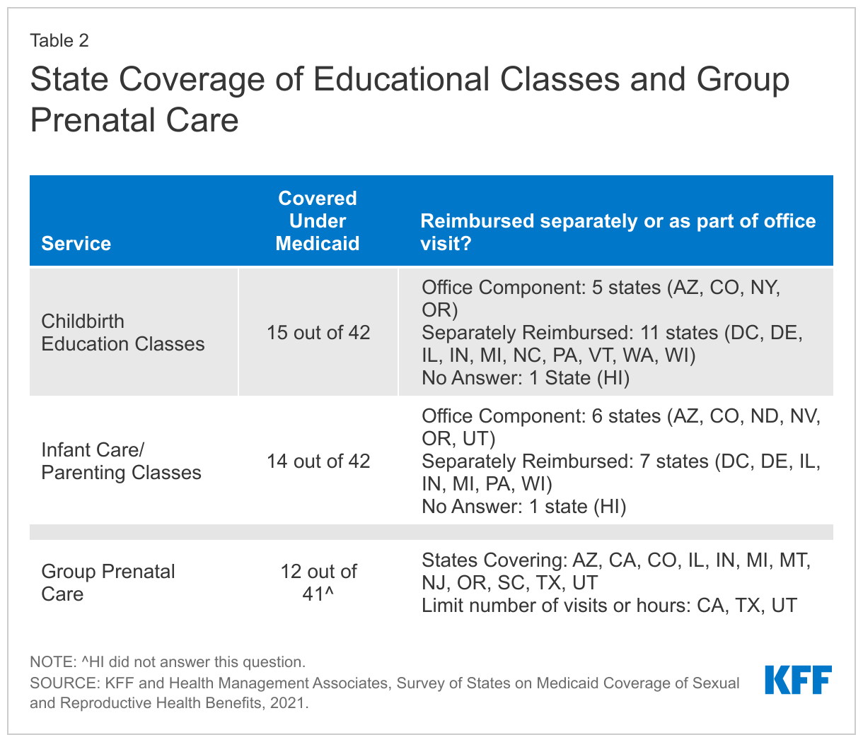 Most states that cover these programs provide separate reimbursements to providers. Eleven states reimburse separately for childbirth education, and five reimburse as an office visit component, while seven reimburse separately for infant care/parenting classes. Colorado limits childbirth and parenting education to provision during routine prenatal visits. Wisconsin only provides childbirth and parenting education to women if they are enrolled in the state’s Prenatal Care Coordination program for those at higher risk of adverse pregnancy outcomes.