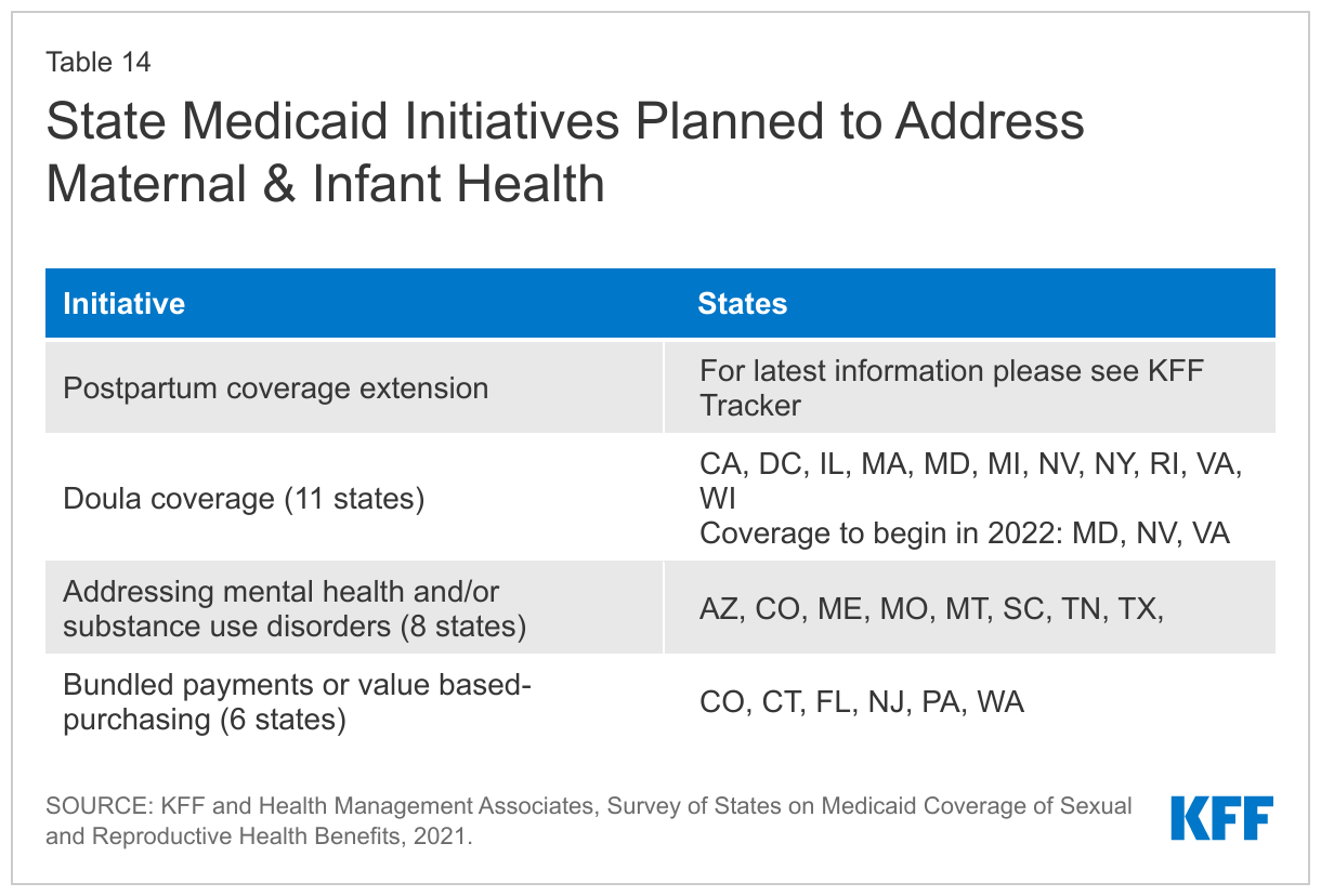 Several states are considering efforts to enhance maternity benefits, particularly extending the postpartum coverage period, adding doula benefits, and developing targeted initiatives to address substance use disorders for pregnant and postpartum beneficiaries. Under federal Medicaid rules, pregnancy-related coverage lasts through 60 days postpartum, but in recent years, there has been interest in extending coverage through the first year postpartum among policymakers at the federal and state levels. Extending postpartum Medicaid coverage was the most commonly reported new initiative that states are considering with regard to maternal health. KFF is tracking state activity on this policy, and the most up to date information is available in this tracker.
