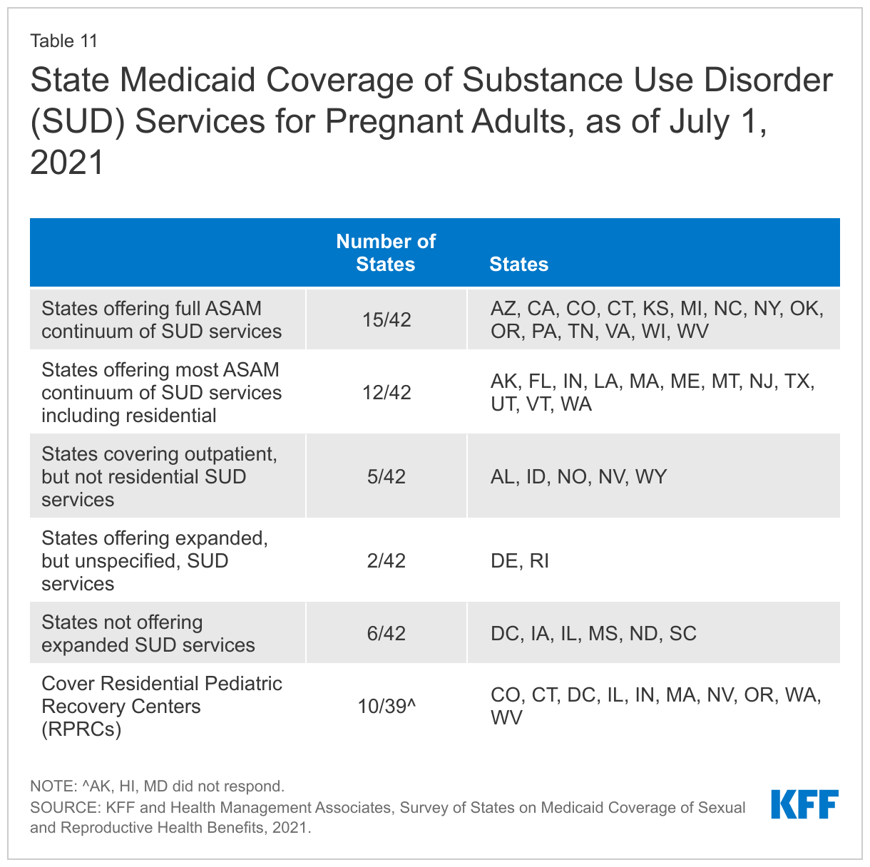 - Most states cover services for pregnant and postpartum individuals with substance use disorder (SUD) beyond federally-required minimum benefits. Federal law requires that states cover Medication Assistance Treatment (MAT) for pregnant and postpartum people with SUD. However, a variety of other services, including residential and inpatient treatment, may be recommended for people with SUD. Of the 42 responding states, 36 reported offering expanded SUD benefits beyond the required benefit of MAT. Additionally, eight states mentioned they are developing initiatives to address substance use or mental health services for pregnant or postpartum beneficiaries.