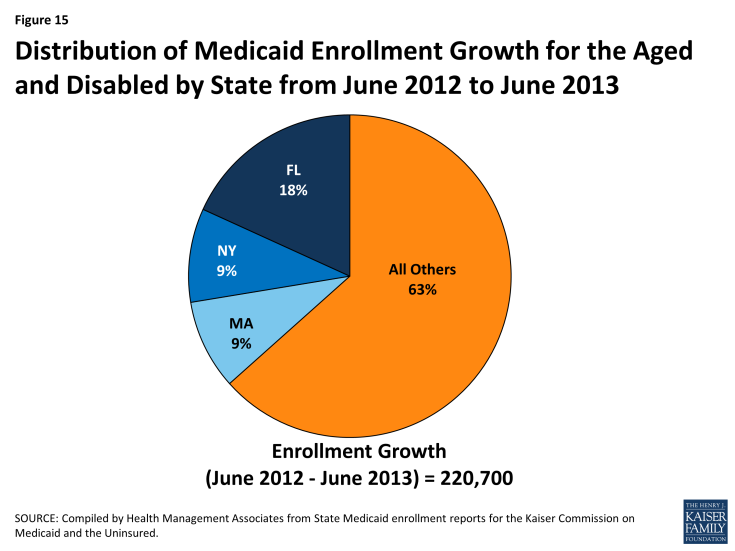 Cross State Trends. Four states (Florida, New York, Massachusetts and Texas) accounted for nearly 40 percent of the annual enrollment growth for this group. (Figure 15) Each of these states has implemented some limited changes to eligibility and enrollment policy in recent years that may partly explain these increases.