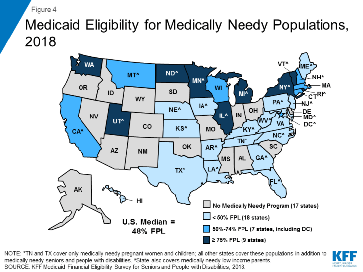 Two-thirds of states (34 of 51) adopt the medically needy option to extend Medicaid to people with high medical expenses who would be eligible in a categorically needy pathway except that their income and/or asset exceeds the maximum limit for that pathway (Figure 4 and Appendix Table 3). Box 2 explains the distinction between categorically and medically needy pathways and provides more detail about establishing eligibility under the medically needy option. All states electing the medically needy pathway must cover pregnant women and children. These states also may extend medically needy coverage to other groups: 32 of 34 states (all but TN and TX) cover medically needy seniors and people with disabilities, and 26 of 34 states (all but CT, HI, MA, TN, TX, VA, WA, and WI) cover medically needy low income parents.14
