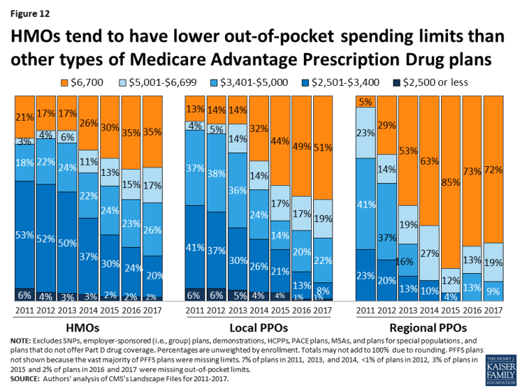 Continuing the trend since 2011, out-of-pocket limits for MA-PDs will be higher in 2017 than in prior years, on average. In 2017, the average plan’s limit will be $5,332, up from $4,281 in 2011 (Figure 11).