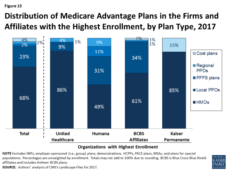 While many organizations offer Medicare Advantage plans, most plans are owned or affiliated with a small number of companies and organizations. In 2016, 7 firms and affiliates accounted for almost three-quarters of all enrollment: UnitedHealthcare, Humana, Blue Cross and Blue Shield (BCBS) affiliated companies (including Anthem BCBS plans), Kaiser Permanente, Aetna, Cigna, and Wellcare. These companies and affiliates account for 64 percent of the plans being offered in 2017 (Table A4).