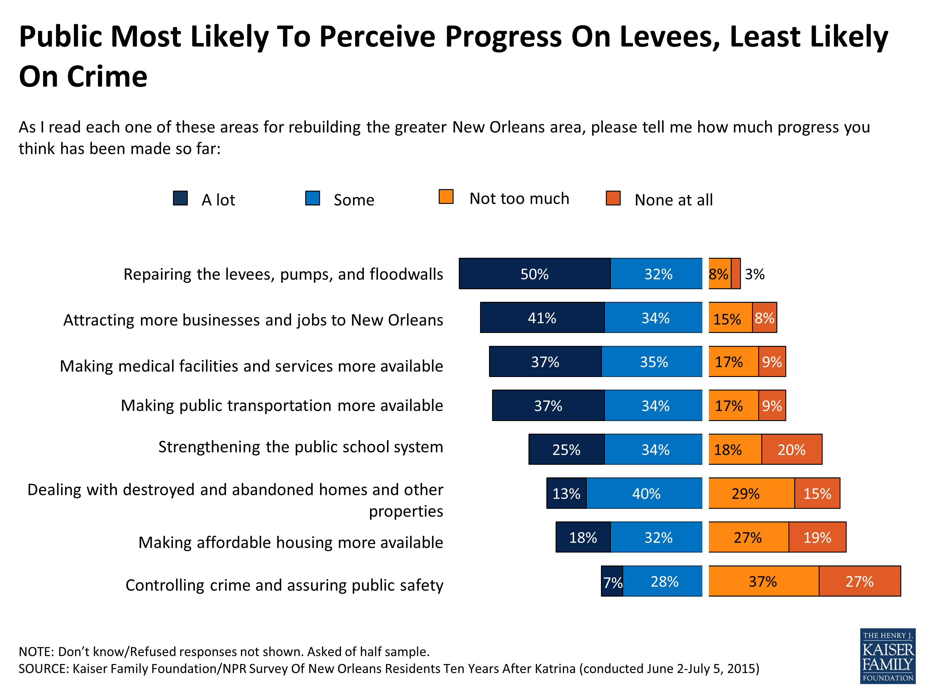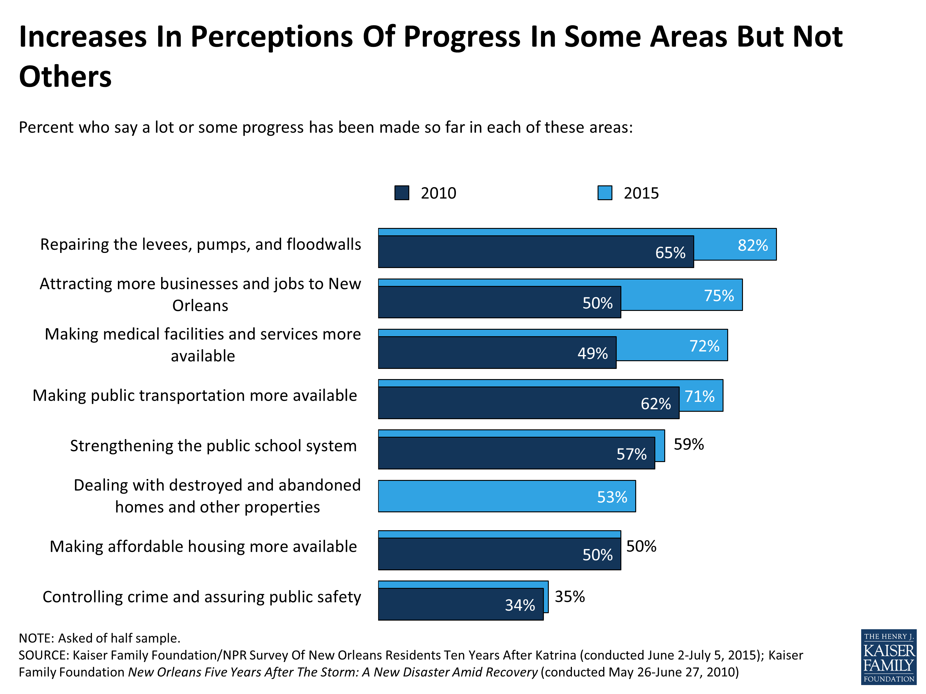 Most New Orleans residents believe that at least some progress has been made on eight of nine key issues facing the city. Most notably, residents seems to recognize the nearly $14 billion dollars spent to repair the city’s storm protection infrastructure after Katrina, as over eight in ten (82 percent) say at least “some” progress has been made in repairing the levees, pumps and floodwalls, including 50 percent who say there has been “a lot” of progress. More than seven in ten say progress has been made in attracting more businesses and jobs to New Orleans (75 percent), making medical facilities and services more available (72 percent), and making public transportation more available (71 percent), and at least half perceive progress in strengthening the public school system (59 percent), dealing with destroyed or abandoned buildings (53 percent), and making affordable housing more available (50 percent). By contrast, just about a third (35 percent) say at least some progress has been made in controlling crime and assuring public safety, while two-thirds (64 percent) say there has been little to no progress in this area.