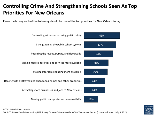 Reflecting the fact that crime is the area where residents are least likely to perceive progress, it is also at the top of the list of residents’ priorities for the city going forward. Four in ten (41 percent) say controlling crime and assuring public safety should be “one of the top priorities” for New Orleans today, followed by strengthening the public school system (37 percent). Though the vast majority believe progress has been made in repairing the levees, pumps, and floodwalls, one-third (33 percent) say this should continue to be a top priority, ranking third on the list. About a quarter each would place a top priority on medical facilities (28 percent), affordable housing (27 percent), dealing with abandoned properties (24 percent) and attracting more jobs to the area (24 percent), while fewer (16 percent) prioritize improvements to public transportation.