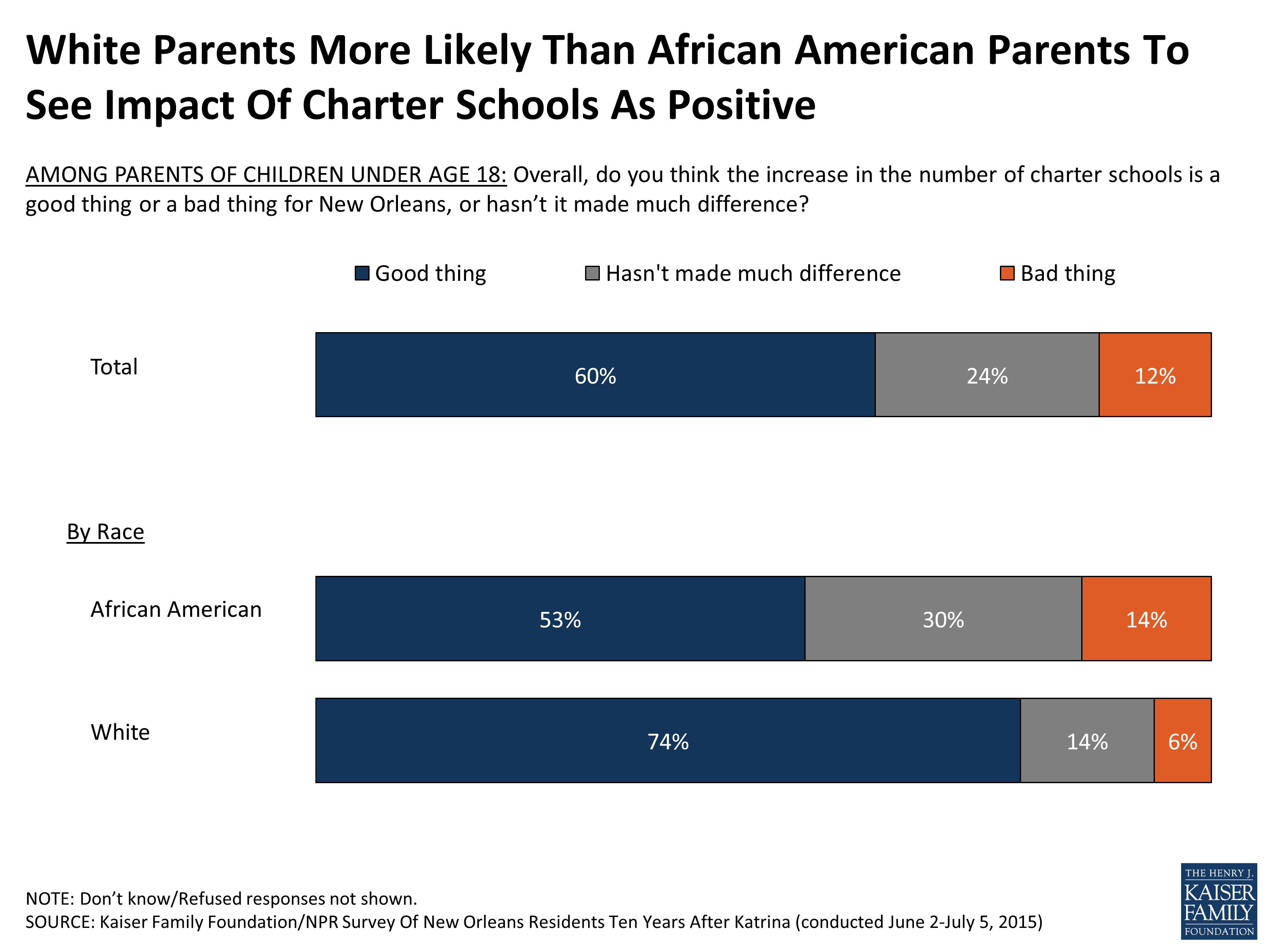 The public school system in New Orleans today looks nothing like it did prior to Hurricane Katrina. In May 2014, the Recovery School District, a state control board that had been overseeing most of the city’s public schools since 2005, shut down the last of its five traditional public schools, making New Orleans the first school district in the nation to be made up entirely of charter schools.8 The survey finds a majority (60 percent) of parents believe the increase in charter schools is a good thing for New Orleans, while a quarter (24 percent) say it hasn’t made much difference and 12 percent say it is a bad thing. Statistics show the student body of public schools, including charters, is 85 percent African American.9 Thus, it is notable that African American parents are somewhat more ambivalent about the increase in charter schools; though a slim majority (53 percent) of this group views the trend as a good thing, 14 percent see it is a bad thing and 30 percent say it hasn’t made much difference.