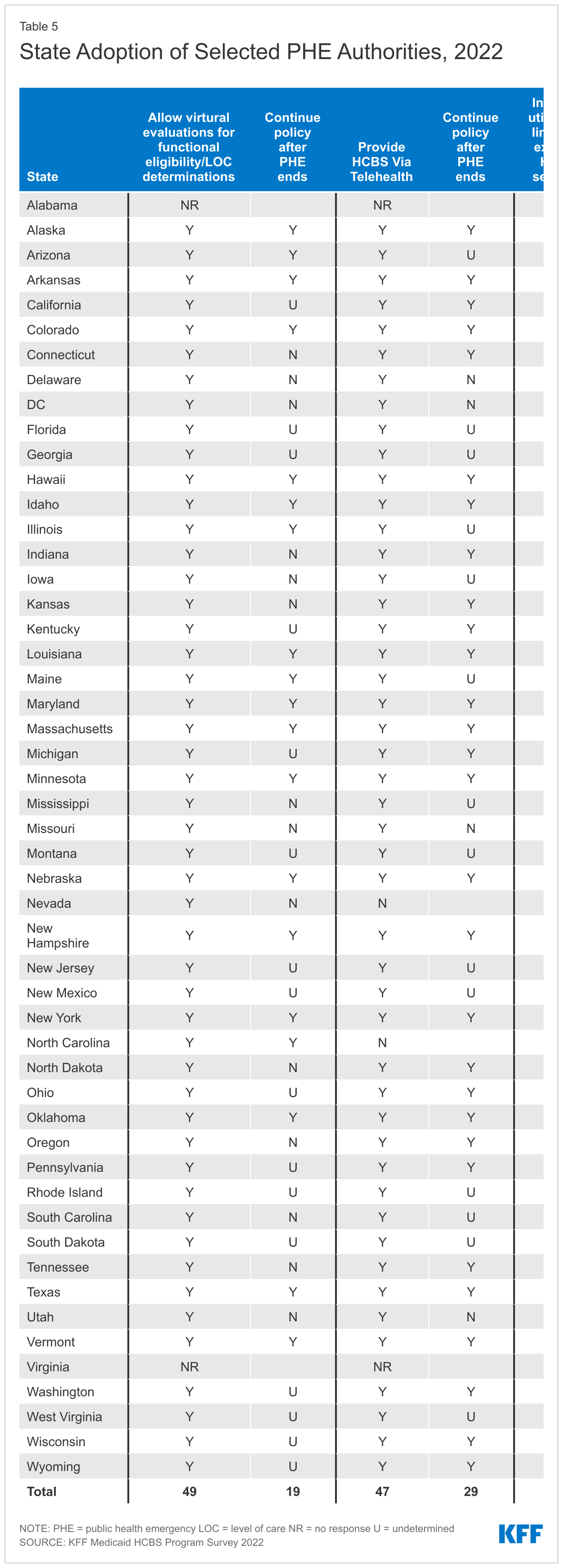 States adopted policies to streamline enrollment processes and expand access to Medicaid HCBS during the PHE, and states reported that some policies (e.g. telehealth) will continue after the PHE ends. All states (49 of 49 reporting) allowed virtual evaluations for eligibility determinations and almost all (47 of 49 reporting) provided telehealth service delivery. Many states also provided more services to HCBS users by increasing utilization limits or offering new waiver services. Telehealth service delivery will continue in most states but increases in utilization limits are more likely to expire at the end of the PHE. Fewer states opted to use the PHE authorities to expand waiver slots or eligibility.