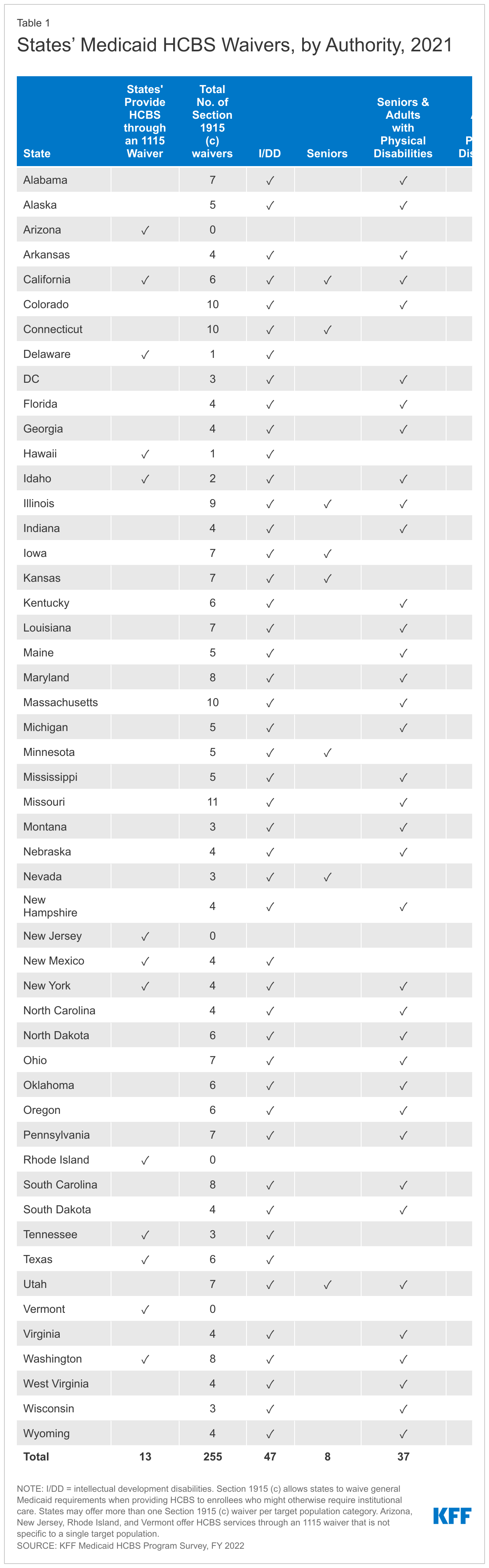 Four states reported offering new waivers in 2021, the most recent year in which states were asked to report all of their HCBS waivers. Alabama and the District of Columbia reported new 1915(c) waivers serving populations with I/DD, while Missouri had a new 1915(c) waiver serving seniors and adults with physical disabilities. Idaho reported offering a new Section 1115 waiver serving individuals with mental illness. Additionally, Oregon submitted a new 1115 waiver request to provide in-home supports to individuals with higher income and assets and for those who do not meet nursing facility level of care criteria. Tennessee has pending waiver amendments to integrate the 1915 (c) waivers into its 1115 waiver.