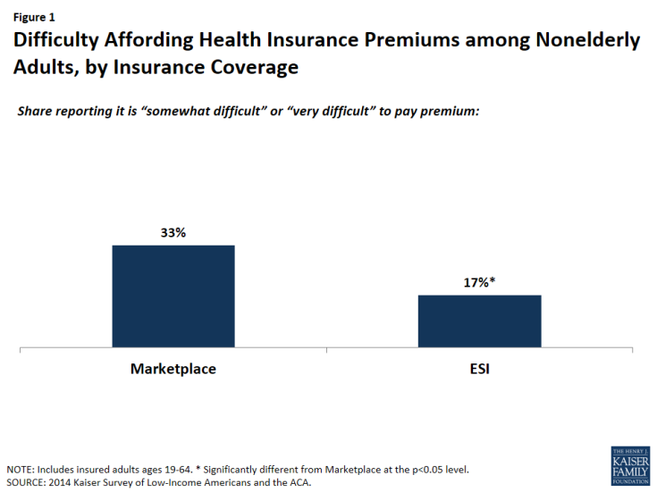 According to survey data, one-third of those with Marketplace coverage reported difficulty paying their premium (Figure 1). This finding is consistent with other surveys of Marketplace enrollees in which a third report dissatisfaction with their premium and 36% report dissatisfaction with their deductible.3 In comparison, the survey finds that only 17% of those with coverage through their employer reported a similar difficulty.