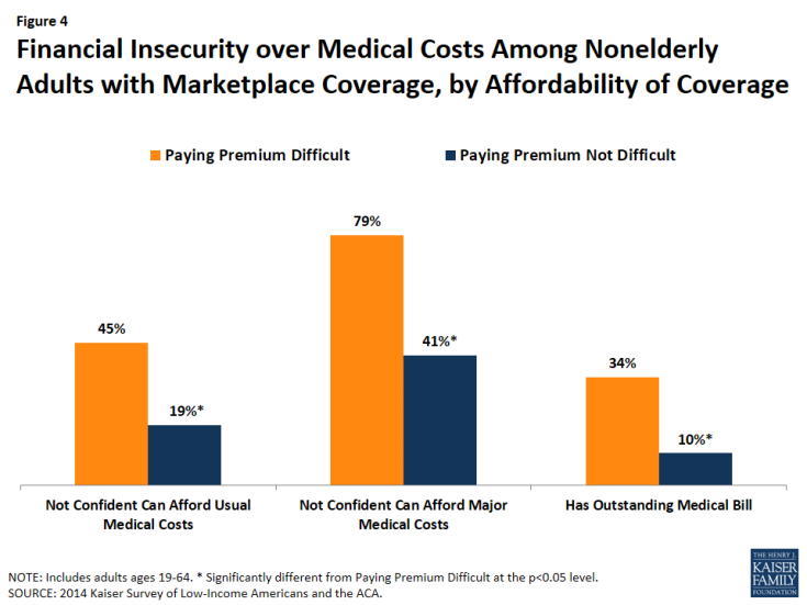 For adults reporting difficulty paying their premiums, having coverage eased somewhat, but not fully, financial insecurity over medical costs. Compared to those with affordable coverage, adults having trouble affording their coverage expressed less confidence in their ability to pay for both usual and major medical costs. Over four in ten were not confident they could afford usual medical costs and nearly eight in ten were not confident they could afford major medical costs, compared to just two in ten and four in ten, respectively, of those with affordable coverage (Figure 4). In addition, they were three times more likely to report having outstanding medical debt compared to those with affordable coverage (34% vs. 10%). Medical debt can place significant stress on family budgets and is a major contributor to personal bankruptcies.5