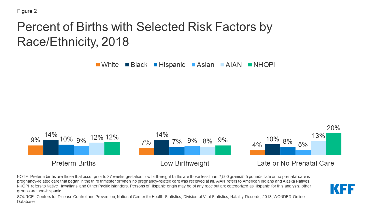 Black, AIAN, and NHOPI women are more likely to have certain birth risk factors that contribute to infant mortality and can have long-term consequences for the physical and cognitive health of children. Preterm birth (birth before 37 weeks gestation) and low birthweight (defined as a baby born less than 5.5 pounds) are some of the leading causes for infant mortality. Not receiving pregnancy-related care until late in a pregnancy (defined as starting in the third trimester) or not receiving any pregnancy-related care at all can also increase risk of pregnancy complications since early and regular prenatal care is important for monitoring health, managing existing medical conditions, and sharing health information. Black, AIAN, and NHOPI women have higher shares of preterm births, low birthweight births, or births for which they received late or no prenatal care compared to White women (Figure 2). Notably, NHOPI women are five times more likely than White women to not begin receiving prenatal care until the third trimester or to no receive any prenatal care at all (20% vs. 4%). Hispanic women also are twice as likely compared to White women to have a birth with late or no prenatal care compared to White women (8% vs. 4%).