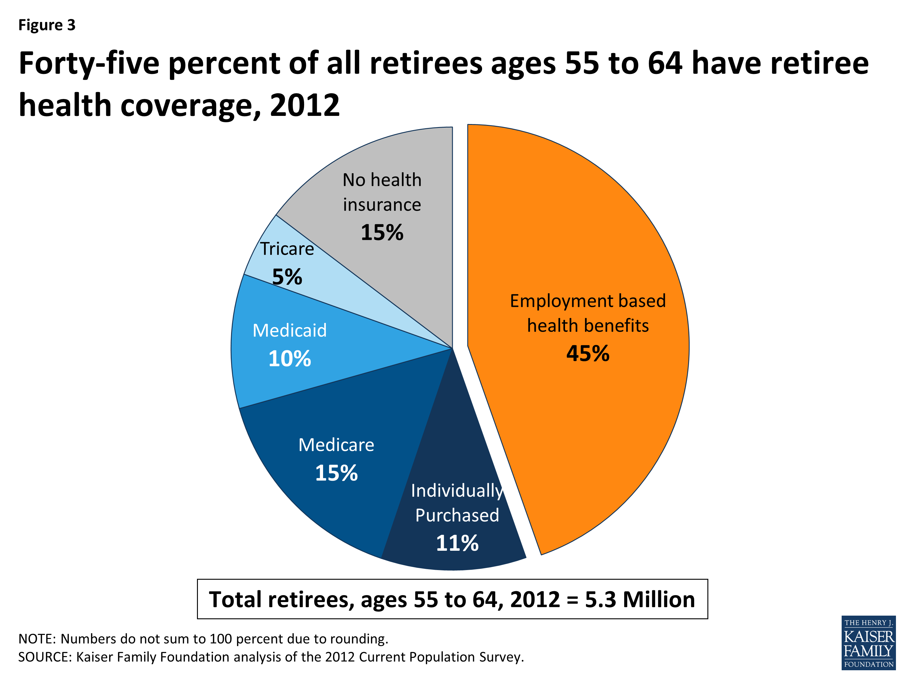 - Paul Fronstin and Nevin Adams, “Employment-Based Retiree Health Benefits: Trends in Access and Coverage, 1997‒2010,” Employee Benefit Research Institute (EBRI) Issue Brief, October 2012. http://www.ebri.org/pdf/briefspdf/EBRI_IB_10-2012_No377_RetHlth.pdf. EBRI estimates 25 percent of the 8.5 million non-working retirees ages 45 to 64 had retiree health benefits, based analysis of the 2010 Survey of Income and Program Participation (SIPP); this produces an estimated 2.1 million retirees. This number is similar to the number of 55 to 64-year old non-working retirees with retiree health benefits (2.4 million), based on the Kaiser Family Foundation’s analysis of the 2012 Current Population Survey (CPS). Neither the EBRI analysis nor the Kaiser Familiy Foundation analysis includes the spouses of retirees. ↩︎