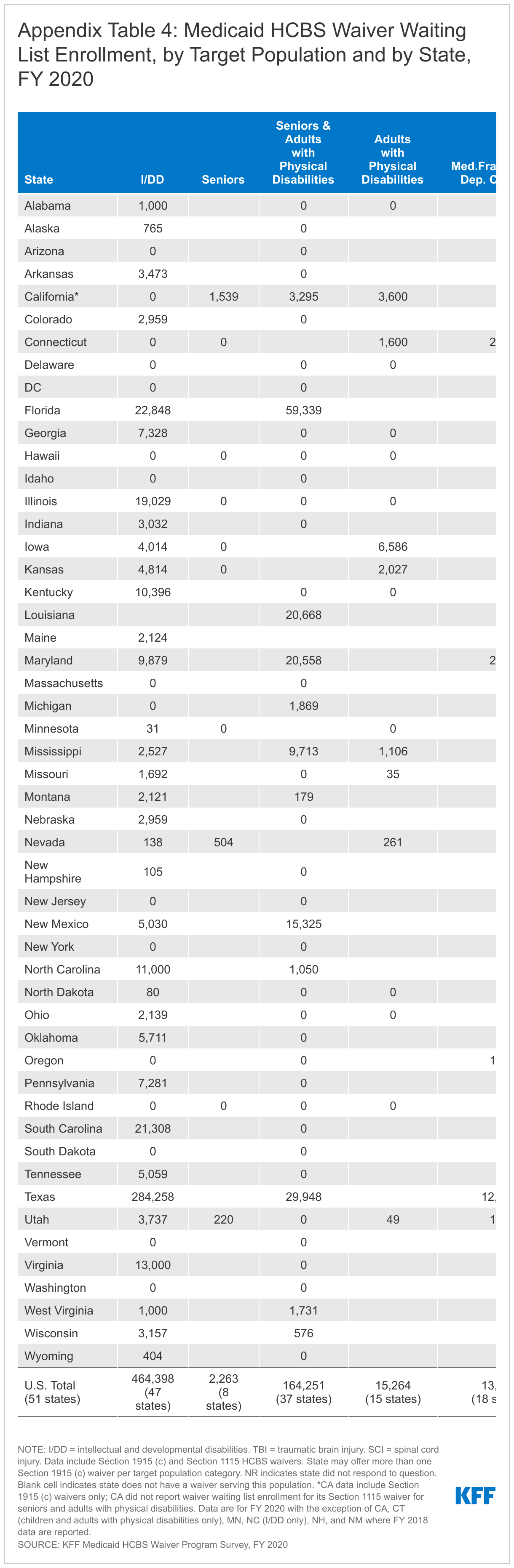 - This total reflects individuals on waiting lists in 39 states reporting waiting lists for Section 1915 (c) and/or Section 1115 HCBS waivers. It includes partial FY 2018 data for California, which reported waiting list enrollment for its Section 1915 (c) waivers serving seniors and/or adults with physical disabilities and people with HIV/AIDS, but did not report enrollment on its Section 1115 waiting list for seniors and adults with physical disabilities. FY 2018 data were also used for CT (children and adults with physical disabilities only), MN, NC (I/DD only), NH, and NM. ↩︎