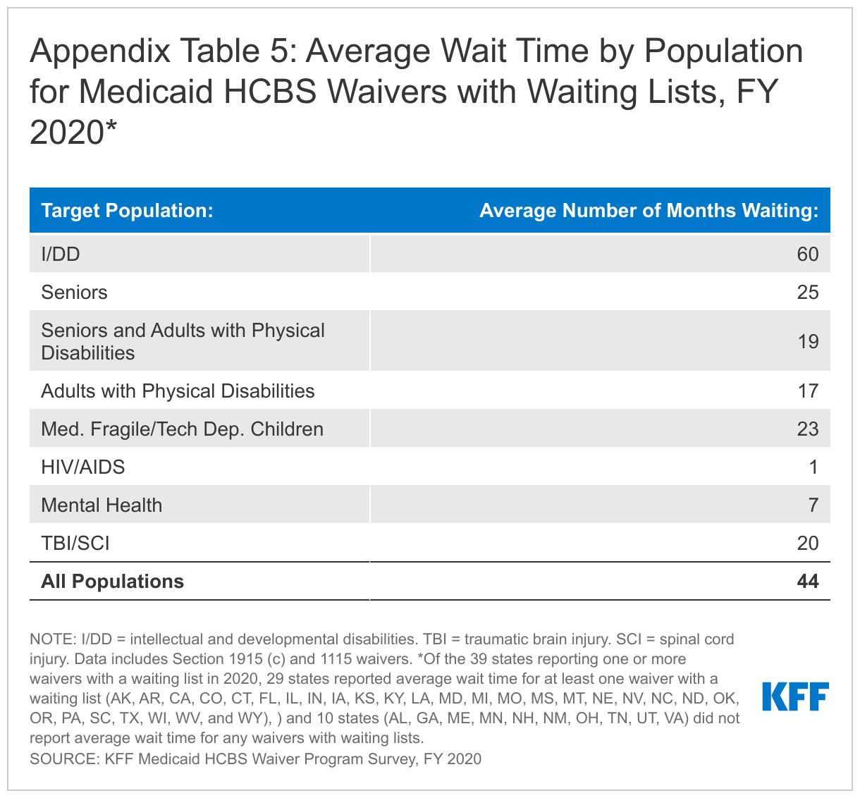 - Of the 39 states reporting one or more waivers with a waiting list, 29 reported average wait time for at least one waiver with a waiting list (AK, AR, CA, CO, CT, FL, IL, IN, IA, KS, KY, LA, MD, MI, MO, MS, MT, NE, NV, NC, ND, OK, OR, PA, SC, TX, WI, WV, and WY), and 10 (AL, GA, ME, MN, NH, NM, OH, TN, UT, VA) did not report average wait time for any waivers with waiting lists. ↩︎