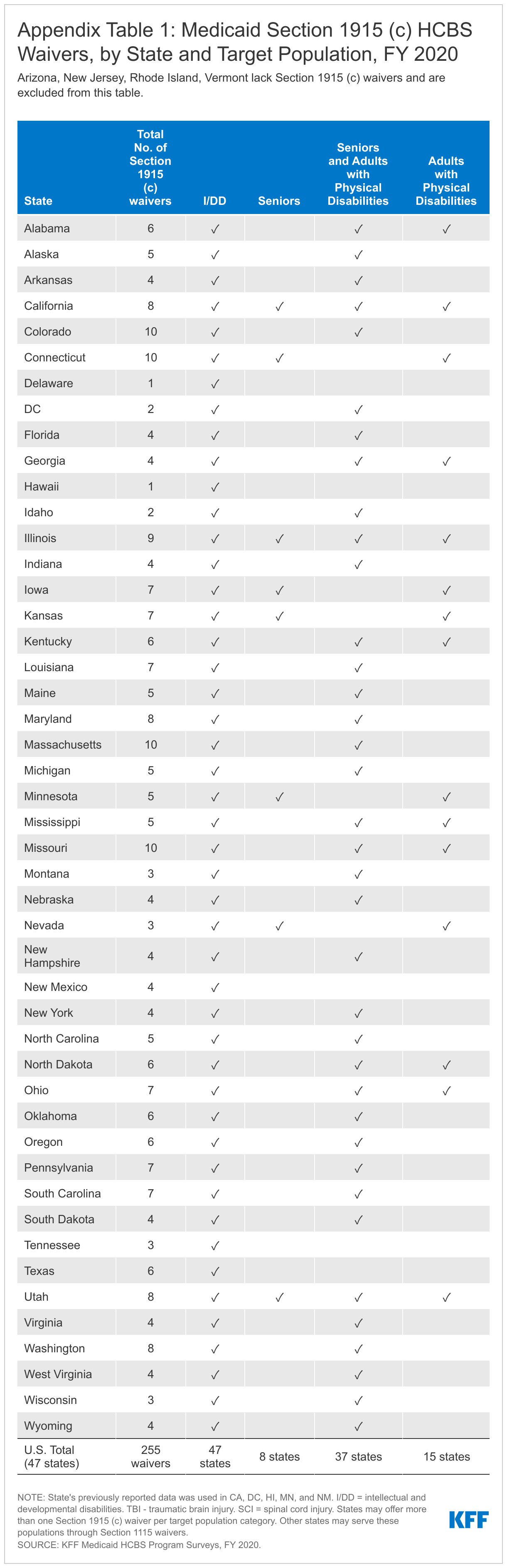 - Section 1115 HCBS waivers are included in our survey if the state does not have an accompanying Section 1915 (c) waiver. ↩︎