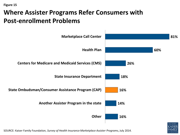 Post-enrollment problems range from consumers not having received their insurance card, to not understanding how to use new health insurance or how to appeal a denied claim. Most Marketplace Assisters are not trained to help consumers appeal denied claims or resolve problems with insurers. Instead, they are supposed to refer consumers to state ombudsman or CAPs, also established by the ACA. CAPs are funded by federal grants, though the last grants were awarded in 2012 and, as a result, some CAPs have stopped providing services and some others are operating at reduced levels. Many Marketplace Assister Programs appear to be unfamiliar with CAPs, even where they are still operating. When Assister Programs encounter post-enrollment problems they can’t help with, they mostly refer consumers to the Marketplace call center or back to their health plan.