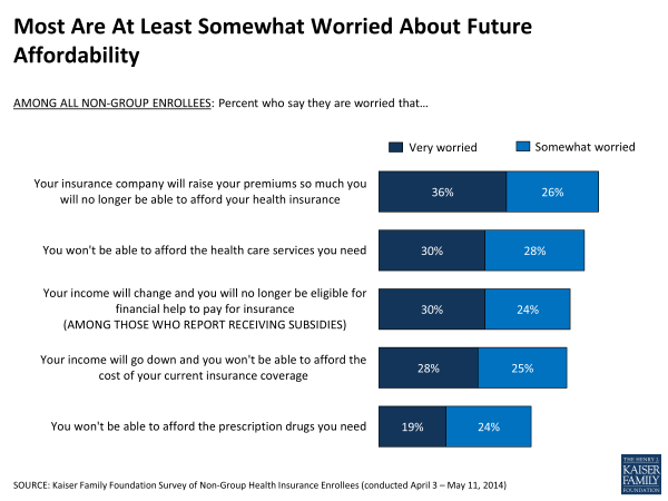 Most people with non-group insurance also express at least some level of worry about their future ability to afford and access care and insurance. For example, about six in ten (62 percent) say they are “very” or “somewhat” worried that their insurance company will raise their premium so much that they will no longer be able to afford insurance. Among those who report receiving government subsidies, over half (54 percent) say they are worried that their income will change and they will no longer be eligible for this financial help.