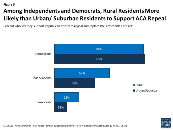 While partisanship is the biggest divider in how Americans view the ACA, the survey finds that among Democrats and independents, rural residents are more likely than their urban and suburban counterparts to support Republican efforts to repeal and replace the law. About half (52 percent) of rural independents say they support such efforts, compared with 38 percent of independents in urban and suburban areas. And while most Democrats are opposed, 23 percent of rural Democrats say they support the Republican efforts to repeal and replace the ACA compared with just 12 percent of urban and suburban Democrats.