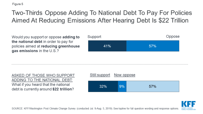 There does not appear to be an appetite among the public for increasing the national debt in order to pay for climate-related policies such as the Green New Deal. Nearly six in ten (57%) say they oppose adding to the national debt in order to pay for policies aimed at reducing greenhouse gas emissions in the U.S., rising to 66% when initial supporters are told that the debt currently stands at around $22 trillion.