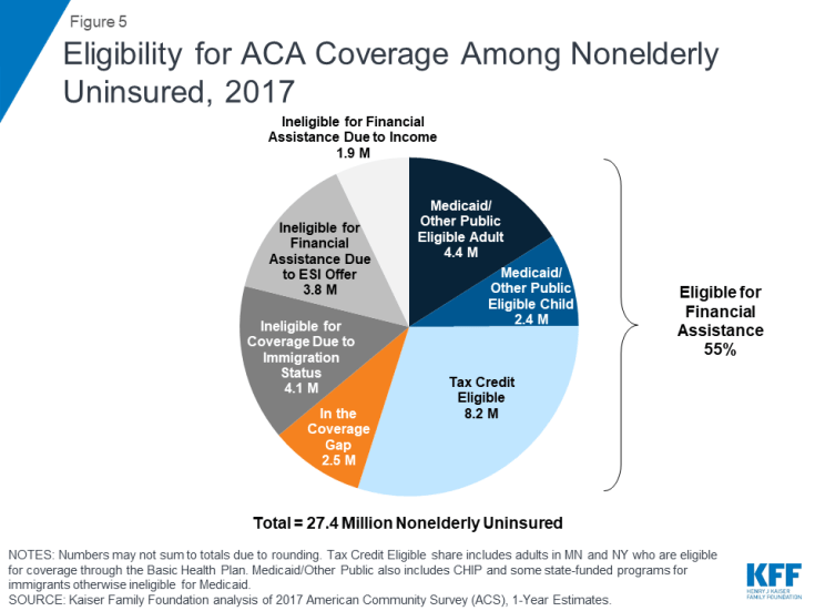 Under current law, nearly half (45%) of the remaining uninsured are outside the reach of the ACA either because their state did not expand Medicaid, they are subject to immigrant eligibility restrictions, or their income makes them ineligible for financial assistance.5 The remainder are eligible for assistance under the law but may still struggle with affordability and knowledge of options. Ongoing efforts to further alter the ACA or to make receipt of Medicaid more restrictive may further erode coverage gains seen under the ACA. On the other hand, state action to take up the ACA Medicaid expansion could make more people eligible for affordable coverage. The outcome of current debate over health coverage policy in the nation and the states has substantial implications for people’s coverage, access, and overall health and well-being.