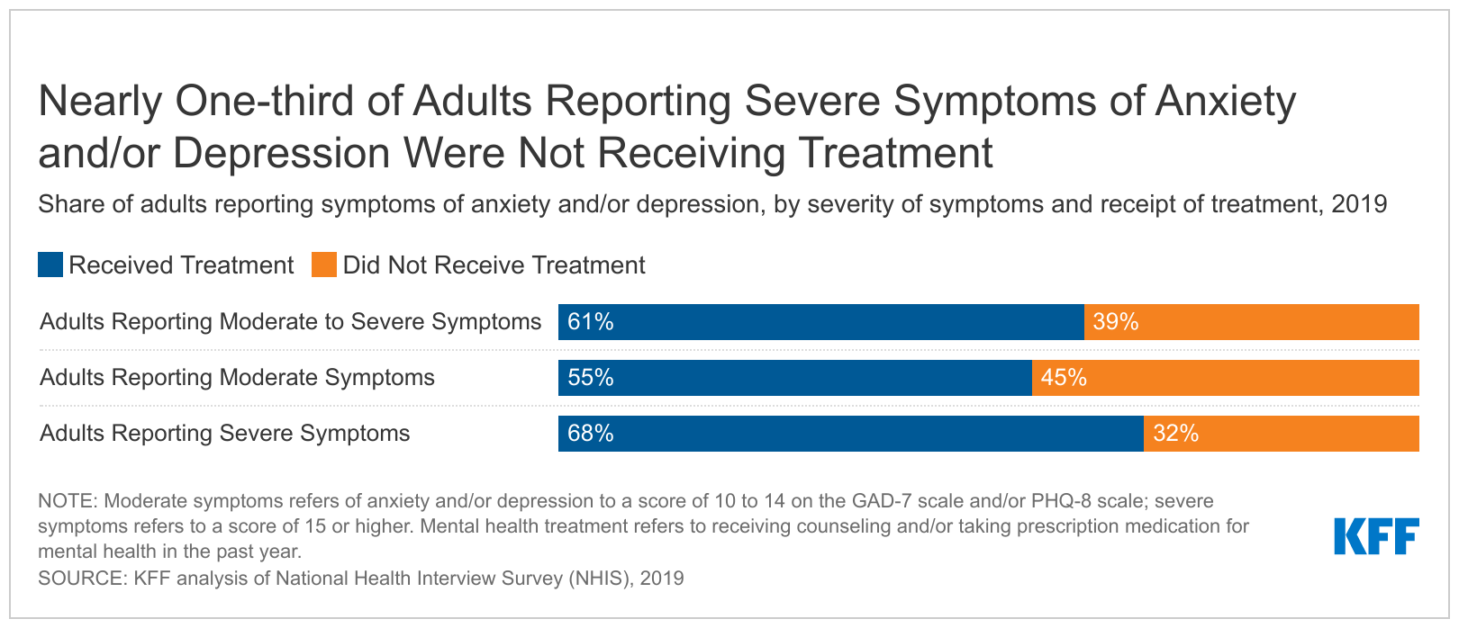This analysis finds that before the pandemic, millions of adults reporting moderate to severe symptoms of anxiety and/or depression were not receiving treatment. Receipt of mental health treatment was lowest among young adults, Black adults, men, and uninsured people.
