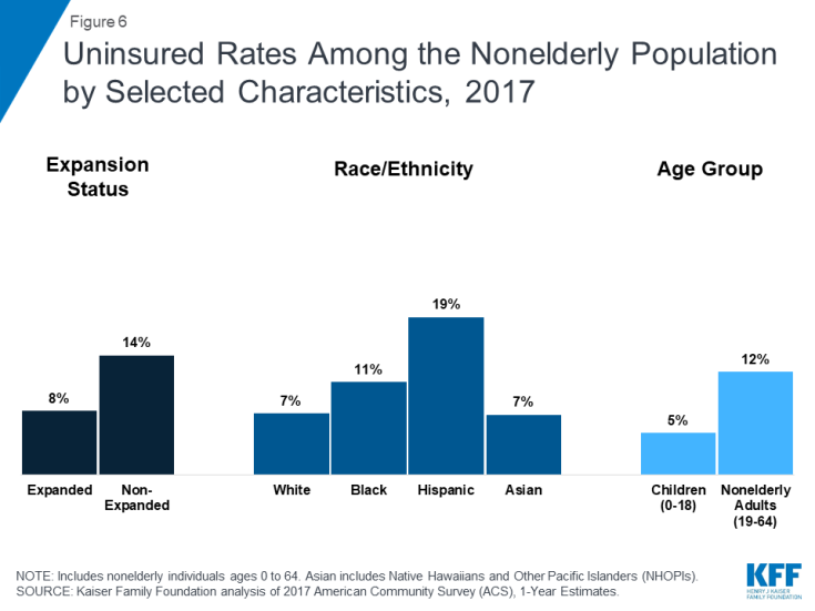 - Uninsured rates vary by state and by region, with individuals living in non-expansion states being the most likely to be uninsured (Figure 6). Thirteen of the eighteen states with the highest uninsured rates in 2017 were non-expansion states as of that year (Figure 7 and Appendix A). Economic conditions, availability of employer-sponsored coverage, and demographics are other factors contributing to variation in uninsured rates across states.