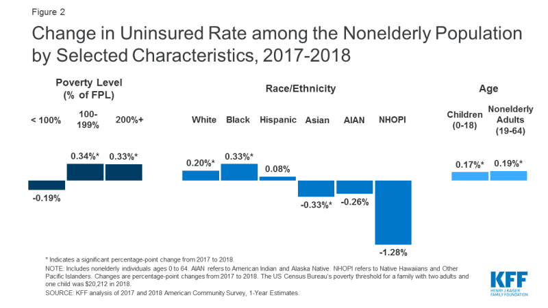 - Continuing trends from the prior year, changes in insurance coverage from 2017 to 2018 showed mixed patterns across groups. While the uninsured rate for poor individuals held steady from 2017 to 2018, the uninsured rate for near-poor nonelderly individuals and those with incomes above 200% of poverty increased significantly (Figure 2). Among people of color, Blacks experienced the largest increase in the uninsured rate by 0.33 percentage points (to 11.5%) in 2018, while the rate for Asians dropped slightly by 0.33 percentages points (to 6.8%), and the rate for Hispanics and Native Hawaiians and Other Pacific Islanders did not significantly change (Figure 2). The number of uninsured children grew by over 100,000 from 2017 to 2018 and the uninsured rate for children ticked up nearly 0.2 percentage points from just under 5.0% in 2017 to 5.1% in 2018. Though these percentage point changes are small, they translate to a large number of people who lost coverage.