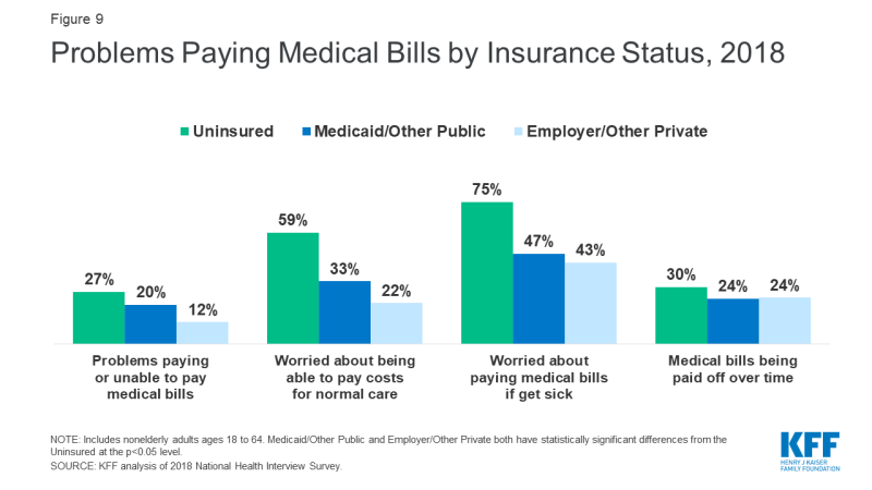 - Medical bills can put great strain on the uninsured and threaten their financial well-being. In 2018, nonelderly uninsured adults were over twice as likely as those with private insurance to have problems paying medical bills (27% vs. 12%; Figure 9) with nearly two thirds of uninsured who had medical bill problems unable to pay their medical bills at all (64%, data not shown).51 Uninsured adults are also more likely to face negative consequences due to medical bills, such as using up savings, having difficulty paying for necessities, borrowing money, or having medical bills sent to collection.52