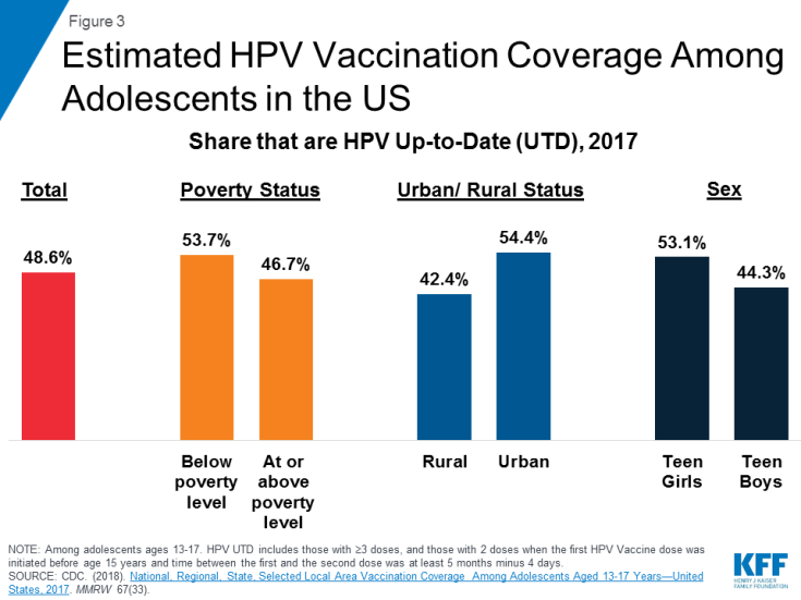 - In 2017, almost half of adolescents aged 13-17 were up-to-date with their HPV vaccinations (HPV UTD) (Figure 3).28 Adolescents whose families live below the poverty line and those living in urban areas were more likely to be HPV UTD compared to adolescents whose families live above the poverty line or live in rural areas. HPV vaccination rates among teen boys are lower than for girls (44% vs. 53% HPV UTD in 2017), but they have been rapidly rising since 2011.29