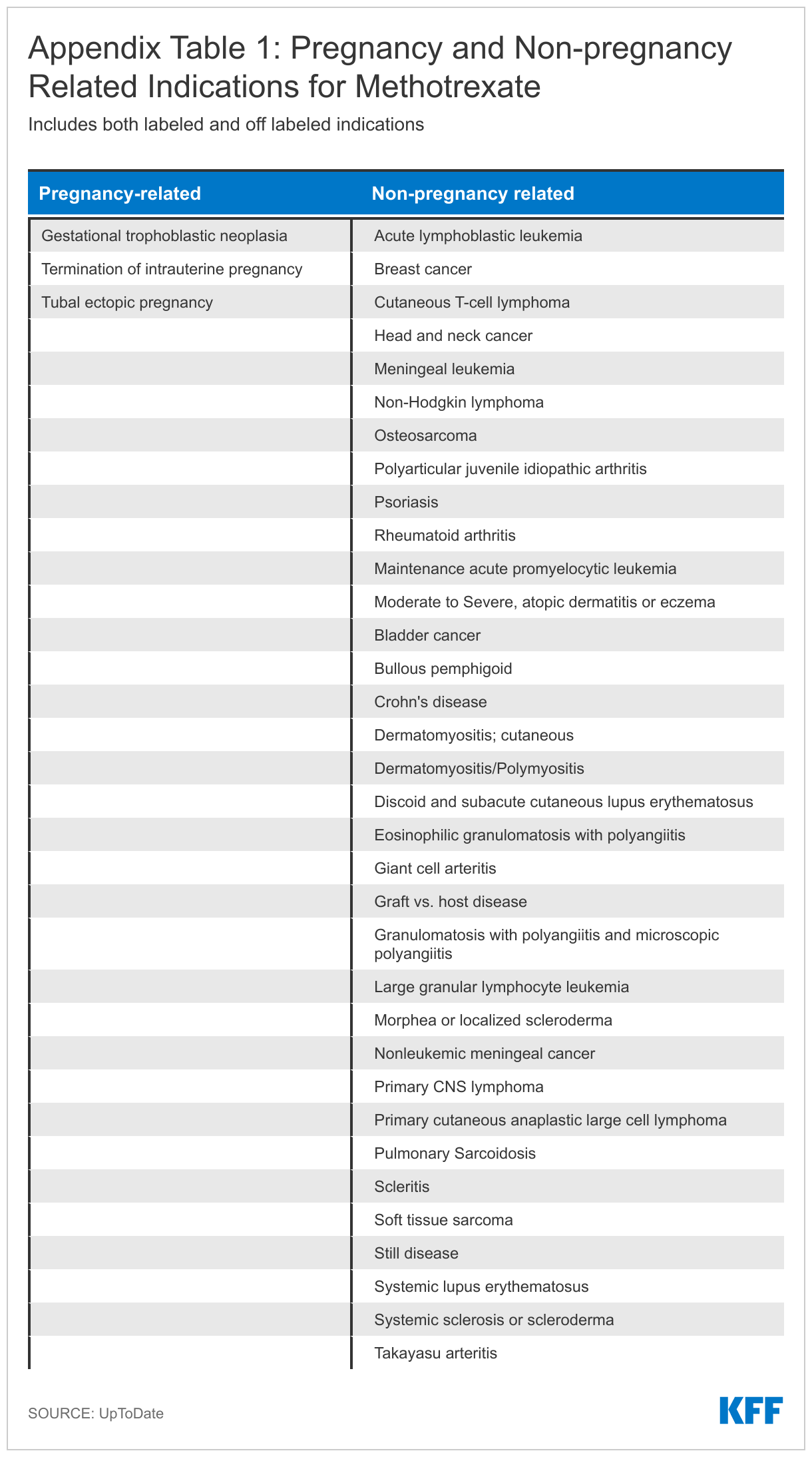 Beyond methotrexate, another drug that may be limited because of its use in pregnancy terminations is misoprostol. Misoprostol is a prostaglandin that causes cervical softening and dilation, as well as uterine contractions. It is frequently used in obstetrics and gynecology for procedures like the medical management of miscarriage, induction of labor, cervical ripening before surgical procedures, and the treatment of postpartum hemorrhage. It is also indicated for reducing the risk of nonsteroidal anti-inflammatory drug (NSAIDs like aspirin and ibuprofen) induced gastric ulcers in patients at high risk of complications from gastric ulcers. In combination with mifepristone, misoprostol can be used to terminate an intrauterine pregnancy through 70 days gestation. Access to methotrexate and misoprostol is essential for patients, especially women, with these cross-cutting conditions. A more detailed version of Table 1 can be found in the Appendix.