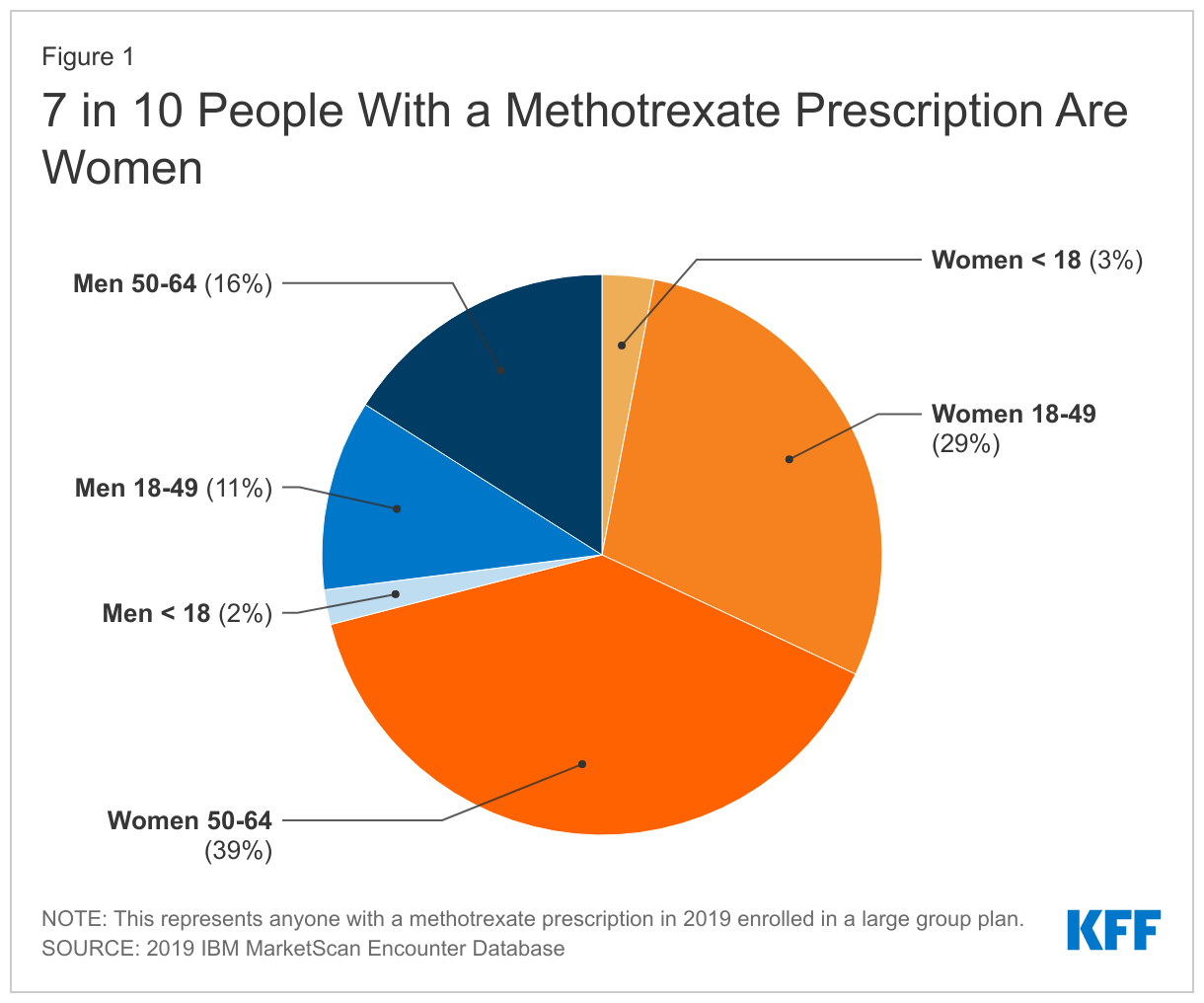 We find that women make up the majority of people (71%) with a methotrexate prescription in the 2019 IBM MarketScan Encounter Database compared to 29% of methotrexate prescriptions going to men (Figure 1). Over a quarter (29%) of people with a methotrexate prescription are women of reproductive age, ages 18-49, while 39% are women ages 50-64.