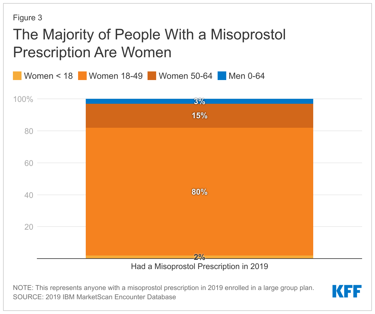 We examined the gender, age, and diagnosis of people with methotrexate and misoprostol prescriptions and injections in claims from the IBM MarketScan Encounter Database in 2019, a database of claims paid on behalf of enrollees of large employer private health plans. We looked at utilization for both men and women enrollees ages 0-64, with a focus on reproductive aged women, ages 15-49, who did not have indication of a pregnancy in the year. The claims used in this analysis only reflect use under the benefit plan and do not include services for which the enrollee did not file a claim such as a medication abortion that was paid for out-of-pocket without using insurance, which could result in an underestimate of individuals using these drugs.