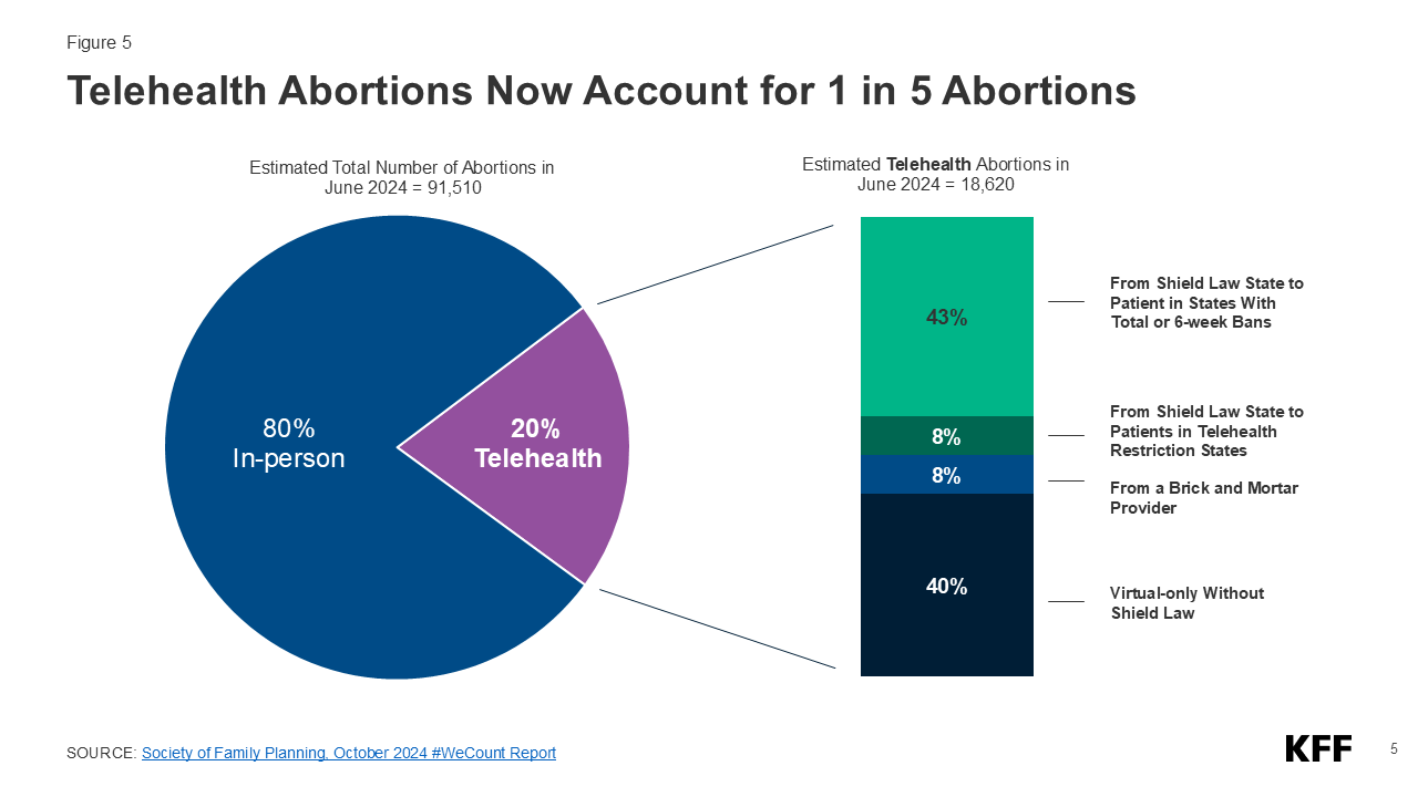 - The upward trend in abortion volume is likely due to multiple reasons, including expanded telehealth capacity, the ability to mail medication abortion pills to patients, and the lower costs for telehealth abortions through virtual clinics compared to in-person care. Medication abortion via telehealth now accounts for 25% of all abortions.