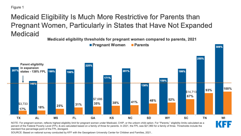 - Raise parental income eligibility levels under Medicaid– Short of full expansion, non-expansion states have another tool at their disposal to narrow the postpartum coverage cliff– raising income eligibility thresholds for parents, which is one of the pre-ACA eligibility categories. States set income eligibility levels for Medicaid. Raising the eligibility thresholds for parents could extend Medicaid eligibility to more low-income mothers and fathers and partially close the coverage gap in non-expansion states. Currently, Wisconsin sets eligibility thresholds for parents at 100% FPL and Tennessee is not far behind at 93% FPL (Table 1). The rest of the non-expansion states are much more restrictive however and currently have large gaps in coverage for parents. States would receive their regular federal match rate for any new enrollees who qualify as a result of higher parental eligibility levels.