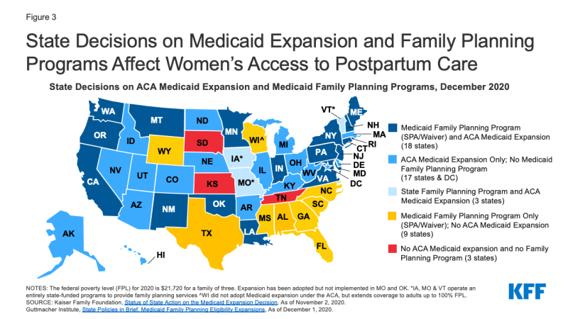 - Provide postpartum coverage for family planning services – Outside of lengthening the postpartum period under Medicaid, half of states provide Medicaid coverage for just family planning services to individuals who do not qualify for full Medicaid coverage. While these programs do not provide coverage that is as comprehensive as full scope Medicaid, they provide access to postpartum and intrapartum contraceptive services, which is important for pregnancy planning and healthy birth spacing. Most of the non-expansion states have a Medicaid or state-funded family planning program (Figure 3). However, in three states – Tennessee, Kansas, and South Dakota – postpartum individuals who were covered by Medicaid for pregnancy likely become uninsured after 60 days because the state has not expanded Medicaid under the ACA, and may not even have access to contraceptive services after pregnancy because the state does not have a Medicaid-funded family planning program.
