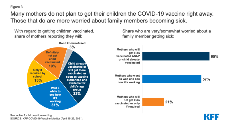 Now that the FDA has authorized the Pfizer vaccine for adolescents, with younger children likely soon to follow, eyes have begun to shift to vaccine uptake among children. However, with less than a third of parents ready to get their children vaccinated right away, it will be important to provide accurate information to address their concerns. In addition, many parents, particularly mothers, report apprehension about side effects, and missing work with respect to their own vaccination decisions. Efforts to address these concerns such as paid sick leave or time off for children’s vaccinations could provide indirect avenues to allay potential fears regarding vaccinations for their children as well. Mothers have long played an outsize role in managing their children’s health, a role which could be central in determining how many children get vaccinated for COVID-19.