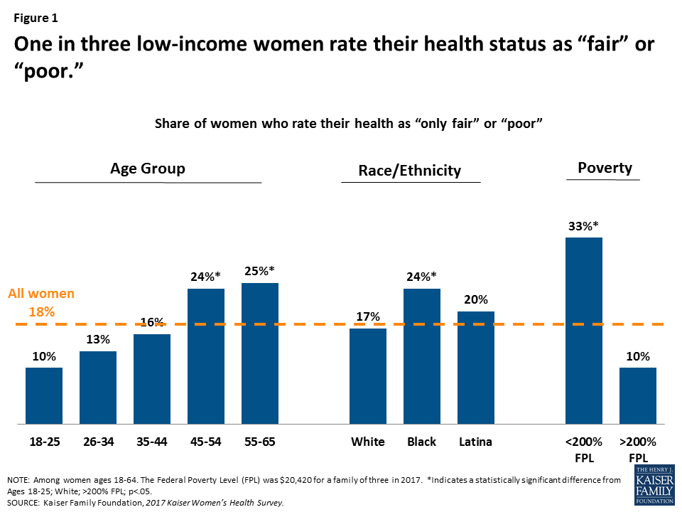 | NOTES: Among women ages 18-64. The Federal Poverty Level (FPL) was $20,420 for a family of three in 2017. *Indicates a statistically significant difference from 18-25, ≥200% FPL, White; p<.05.SOURCE: Kaiser Family Foundation, 2017 Kaiser Women’s Health Survey. | |||||||||||