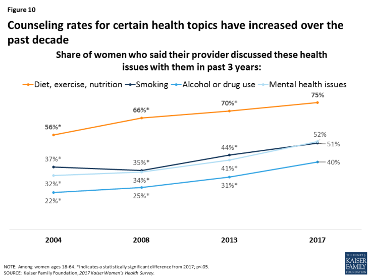 The share of women who report they have spoken with a provider about various health issues has risen over the past decade. In 2004, a third (32%) of women reported recently speaking with a provider about mental health issues, rising to more than half of women (52%) in 2017 (Figure 10). Provider counseling on smoking increased similarly from 37% in 2004 to 51% in 2017. Diet, exercise, and nutrition remains the most frequently discussed health issue, and while there has been a lot of attention about provider roles in curbing alcohol and drug misuse in light of the current opioid crisis, counseling on alcohol or drug use continues to be the least discussed issue.