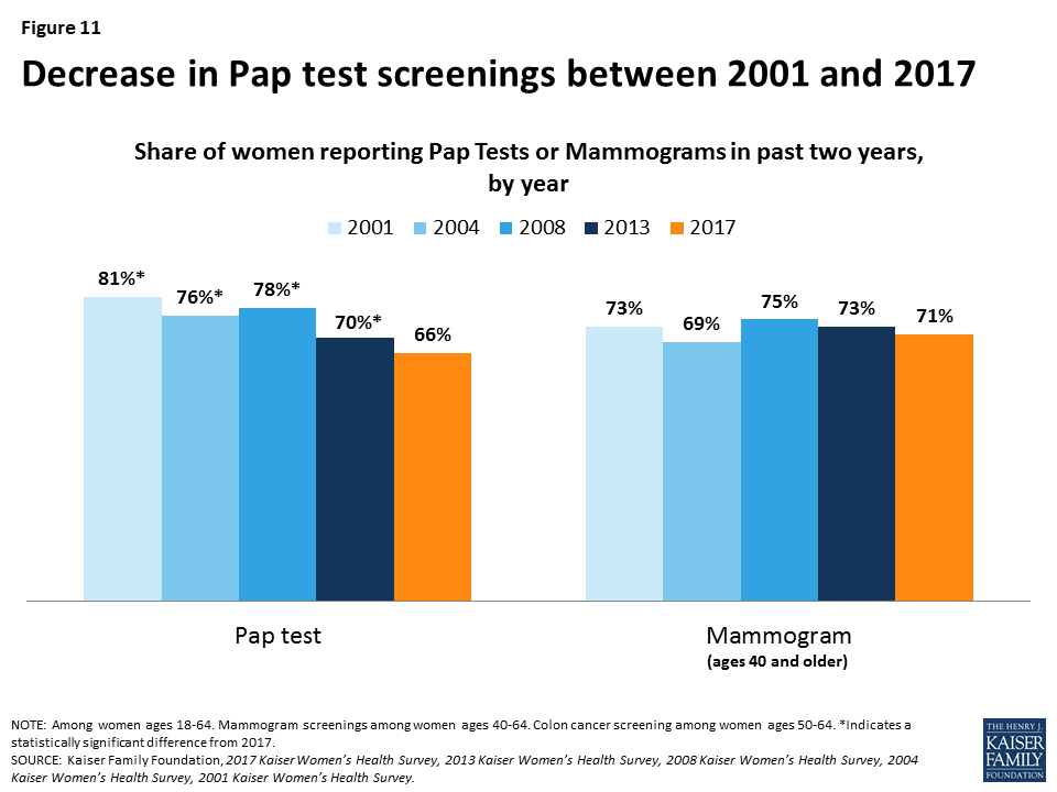 Women’s ability to access the care they need depends greatly on the availability of high quality providers in their communities as well as their own knowledge about maintaining their health through routine checkups, screenings, and provider counseling. This brief presents findings from the 2017 Kaiser Women’s Health Survey, a nationally representative survey of women ages 18 to 64 on their health status, relationships to regular providers and sites of care, and the frequency at which they receive routine preventive care. The Kaiser Family Foundation has conducted surveys on women’s health care in 2001, 2004, 2008, and 2013. This brief focuses on findings from the newest 2017 survey and presents some findings compared to earlier years.