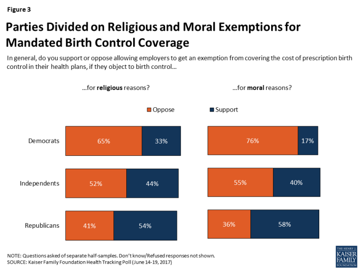 There are strong partisan differences on this issue. A majority of Democrats oppose allowing employers to get exemptions for religious reasons (65 percent) and moral reasons (76 percent). On the other hand, more than half of Republicans support allowing employers to get an exemption if they object to birth control for religious reasons (54 percent) or moral reasons (58 percent). Independents are more divided than partisans but lean toward opposition with about half opposing exemptions to the requirement for religious (52 percent) or moral (55 percent) reasons.
