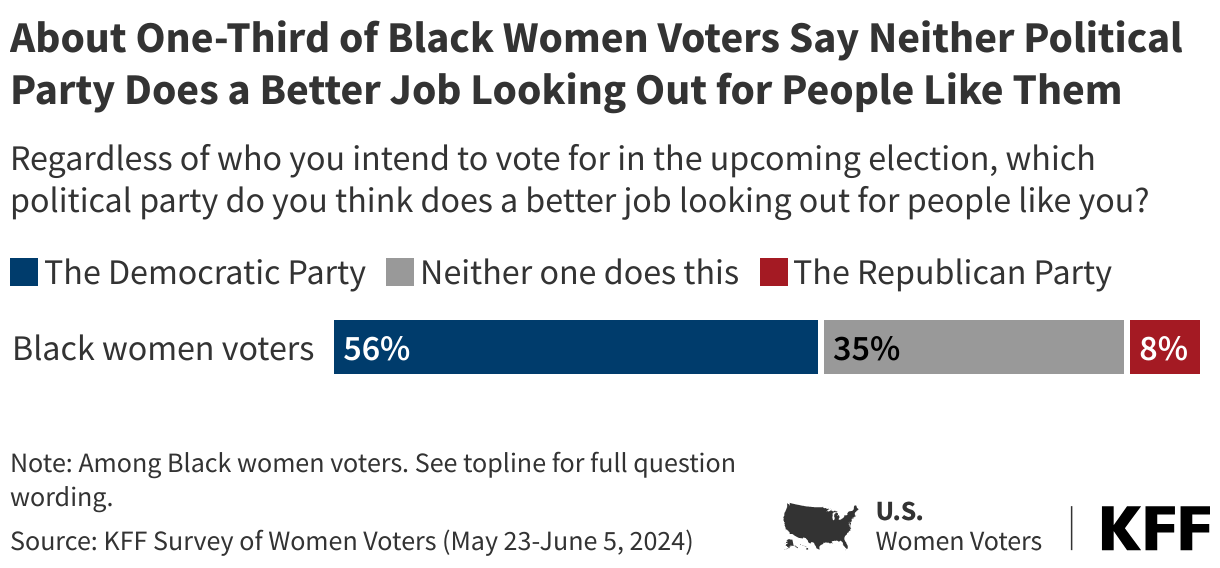 Partisanship may play a larger role in some state specific contexts. Along with the national poll of women voters, the KFF Survey of Women Voters included a representative sample of women voters in Michigan, a key battleground state. While just 6% of Black women nationally say that the candidates’ political party will make the biggest difference to their 2024 vote, this rises to one in five Black women voters in Michigan. On par with Black women nationally, Black women voters in Michigan give the Democratic Party the edge on their assessment of which political party does a better job looking out for people like them, the interests of women, addressing the cost of health care and the cost of household expenses.