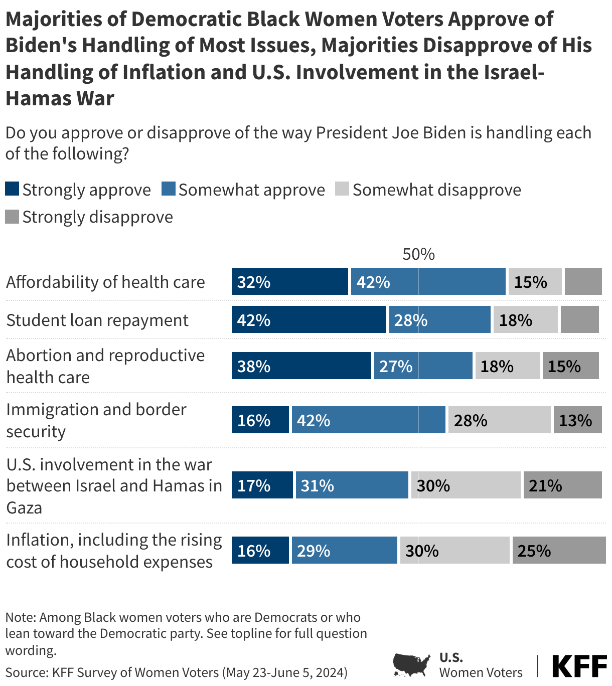 Half of Black women say, regardless of who they intend to vote for, the Democratic Party does a better job addressing the cost of household expenses (51%), while few (8%) say the Republican Party does a better job, and four in ten (41%) say neither party does a better job. However, assessing Biden’s handling of the issue of inflation, a majority (55%) of Democratic Black women voters disapprove, including one in four (25%) who say they disapprove “strongly.” By contrast, majorities of Democratic Black women voters approve of Biden’s handling of most other issues, including immigration, abortion and reproductive health care, student loan repayment, and the affordability of health care.