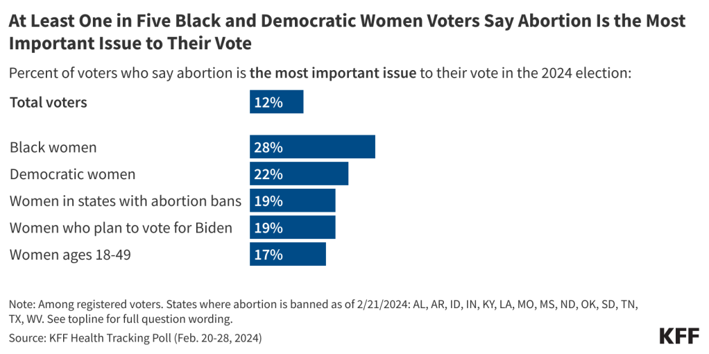 About 1 in 8 voters (12%) now say that abortion is the most important issue for their vote in the 2024 elections, highlighting how the issue could motivate groups of voters who largely say abortion should be legal in all or most cases, a new KFF Health Tracking Poll finds.