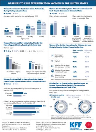 This Visualizing Health Policy infographic looks at barriers to care experienced by women in the United States. Women incur greater health care costs than men, particularly during the reproductive years. Despite a lower uninsured rate than men (11% vs 14%), women are more likely to skip a recommended medical test or treatment due to cost. However, cost barriers to contraception have decreased for insured women since the Affordable Care Act’s (ACA’s) coverage requirements took effect. Three of 4 women reported that insurance covered the full cost of birth control during their most recent visit. Younger women are less likely to report having a regular clinician. Women without a regular clinician are less likely to receive certain preventive services, such as a mammogram and Papanicolaou test. Women are more likely than men to have a preexisting health condition (29% vs 24%) and express concern about the consequences of lifting ACA protections that ban preexisting condition exclusions.